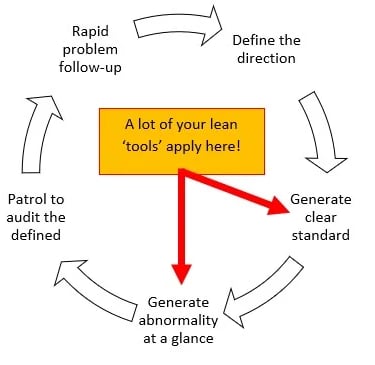 In this cycle, lean thinking hinges itself on being able to create clear standardised work connected to your purpose. Understand what each person does to add value to the customer, understand the difference between normal and abnormal, and build skills and habits in your people to be able to logically see and act upon the abnormalities.