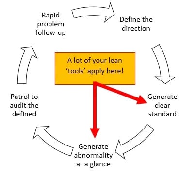 5S: All about workplace organisation and tidy stations so that everything is easy to access, correct? Well, in part, but once again let’s think about it from a learning perspective. 5S is equivalent to ‘generate clear standard’ in Fig 1, by making it clean and giving everything a clear place, it allows me to better understand when an abnormality occurs. 5S effectively slaps me in the face when I see missing 5S items, and the response being either to “simply replace it” or just “go and find it then put it back”. In one single quick action we have circumvented what 5S was trying to tell us in the first place… why is the item missing in the first place?