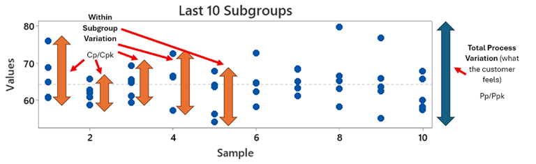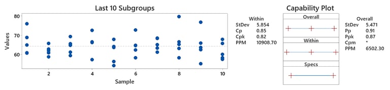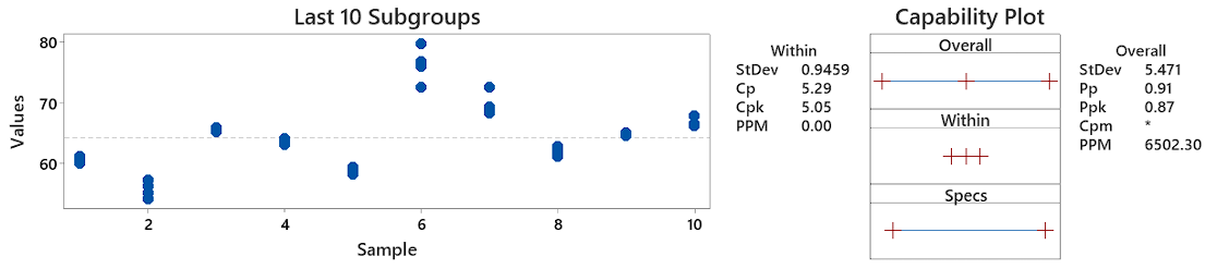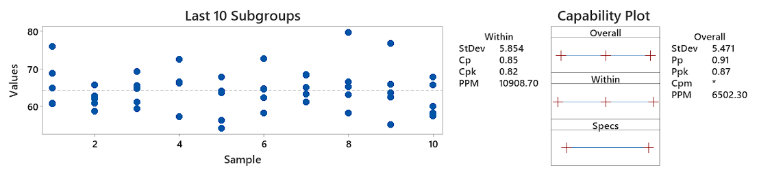 As you can see, the Cp (0.85) and Pp (0.91) and Cpk (0.82) and Ppk (0.87) are not far apart. This effectively shows that the variation you are seeing in each subgroup, is effectively representative of what the customer feels at the end of the day. There doesn’t seem to be noise occurring between subgroups and hence your process may be stable. You can visually see this by the fact that the spread of individual values in each subgroup is fairly similar across all 10 subgroups. If you imagine these 10 subgroups as 10 different operators running a process, it effectively means the variation of each operator is similar, not much is changing between them.