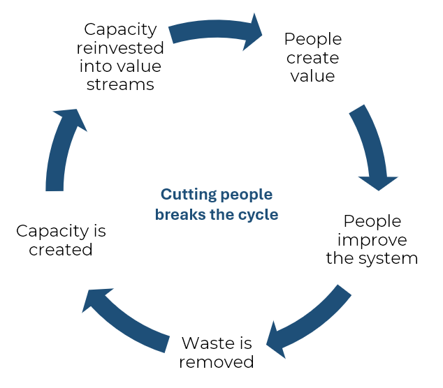 CI is fundamentally about the first of these, improving the system. But when organisations place disproportionate pressure on short-term cost or efficiency targets, the risk is that attention shifts to the second or third. Here is where many organisations unintentionally undermine their own improvement efforts. Because if the default response to increased efficiency is to remove people, a clear message is sent - "Improvement = job losses" - and once that belief takes hold, the consequences are predictable. People become less willing to; surface problems, suggest improvements, engage in change, or support leadership decisions.